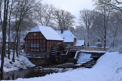 Gebührenfreie, öffentliche Parkplätze befinden sich hinter der Wassermühle