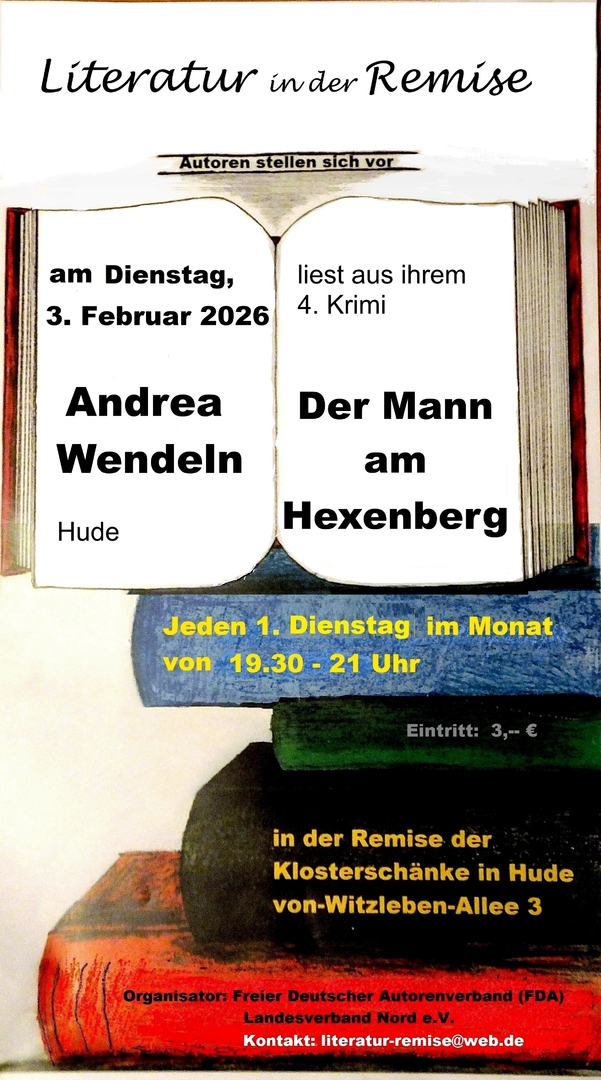 Am Dienstag, den 3. Februar wird bei der monatlichen Lesung des Freien Deutschen Autorenverbandes (FDA Nord) in der Huder Klosterremise die Huder Autorin Andrea Wendeln zu Gast sein. Sie liest aus ihrem neuen Kriminalroman „Der Mann am Hexenberg“, der sich wie die vorherigen Bände auf Ganderkeseer Verhältnisse spezialisiert.